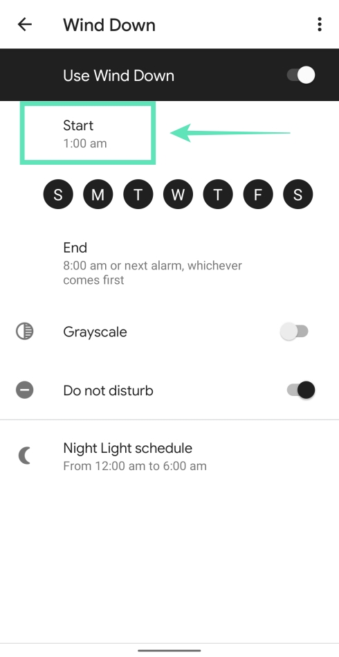 5. Set a Start and End time for the Wind Down mode to kick in.
