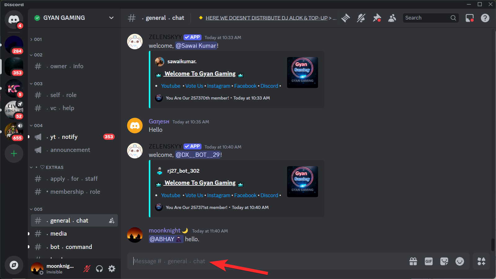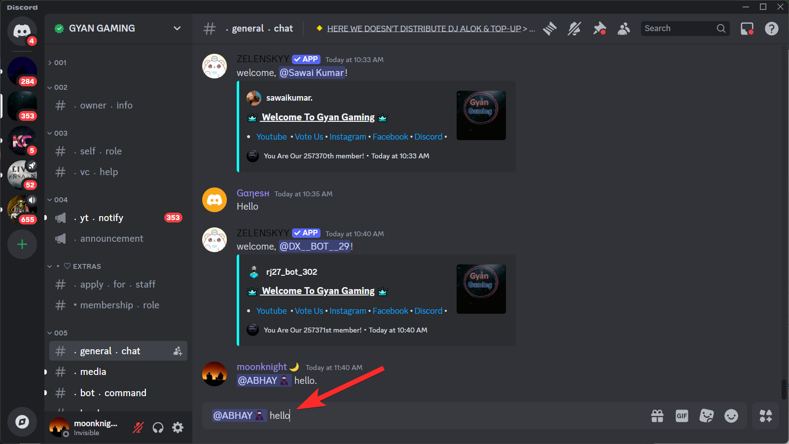 Step 4: Click in the text box and use one of the formats mentioned below to ping someone or the channel depending on your current needs. Replace [username], [player tag], or [nickname] with the relevant information for the user you wish to ping.