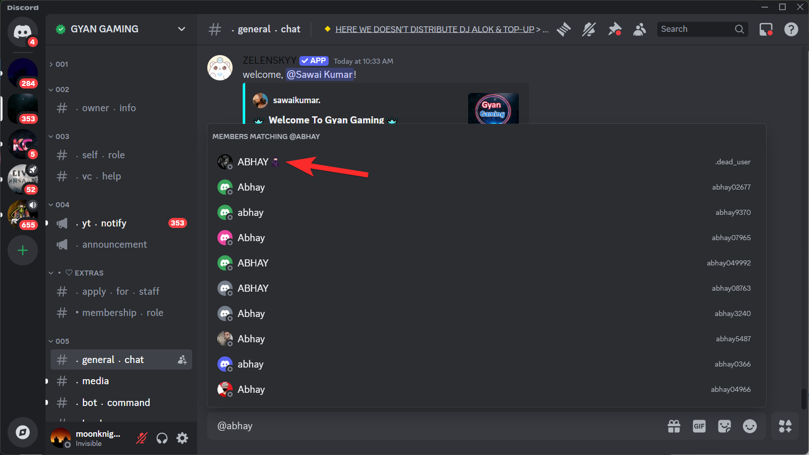 Step 5: Once you’ve added the ping, click and select the concerned user from the list above your ping if there are multiple users with a similar username or nickname.