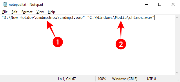 Then paste it into the notepad file as well. Make sure there is a space between the cmdmp3 address and the sound file’s address.