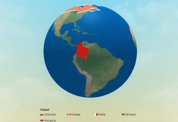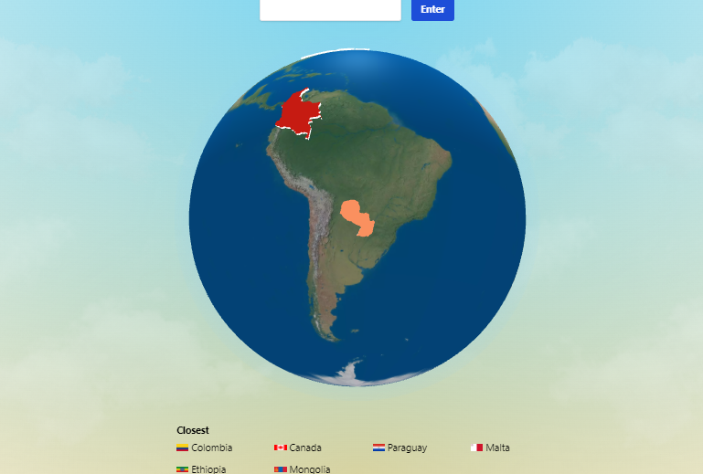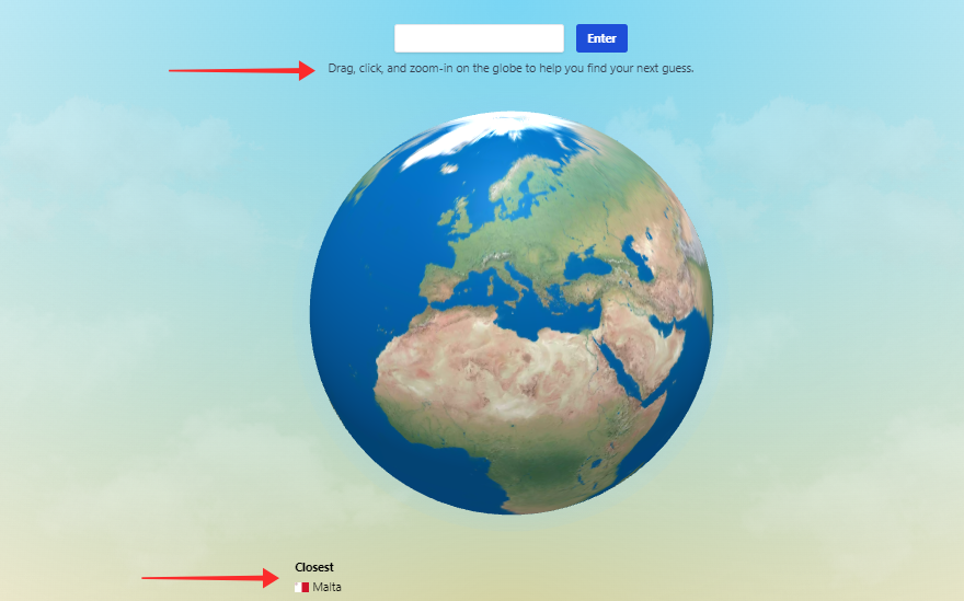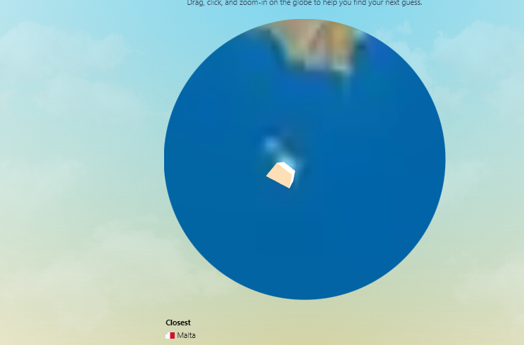 Let’s go with a random pick, “Malta”, for our first guess and submit it to the system using the text box. In response, we get two pointers — 1) feedback for the entry “Malta” is the “closest” so far to the mystery country; 2) to zoom in, drag, and adjust the globe to take a closer look at the country entered as the guess and its surroundings.