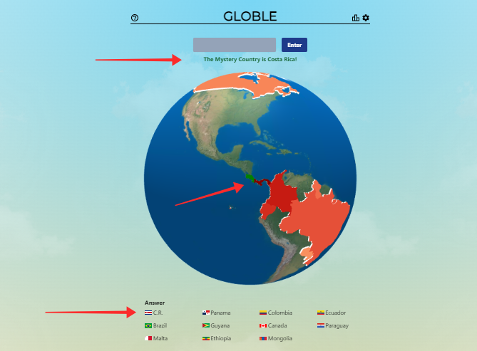 The answer gets revealed in a text under the text box, gets a green highlight on the globe, and also gets listed as the final one amongst all guesses.