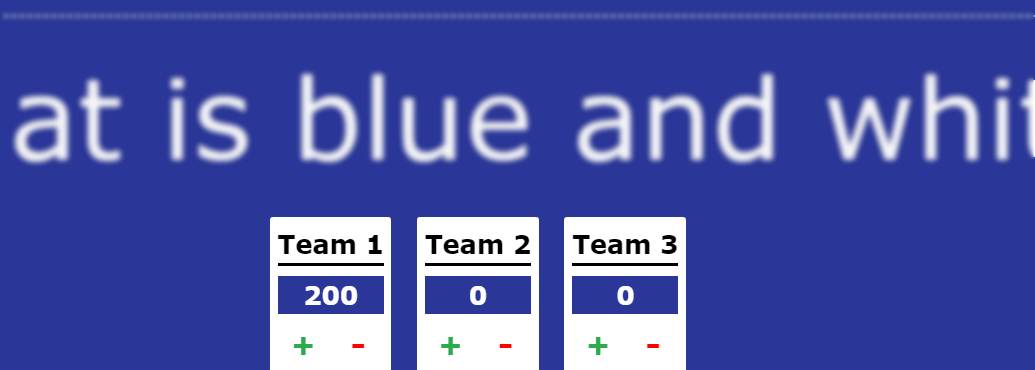 If Team 1 answers the question correctly they get the corresponding points (in this case 300). To view the correct answer, press the space bar on your keyboard (only host). To award points, click the + next to the team’s name.