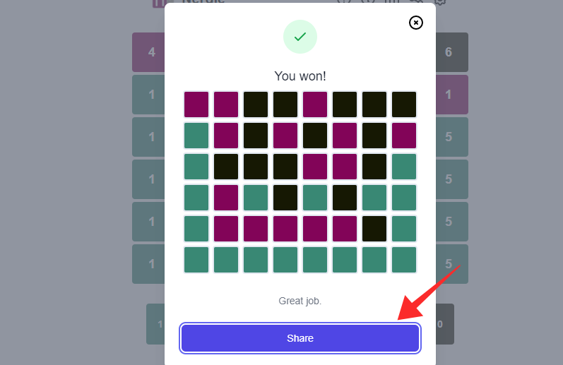 Sharing the Nerdle score is not much different from how things work on Wordle. Just click or tap on the Share button on the score-popup to copy the result and you can paste it into the composition box of your social media like Twitter, Facebook, Whatsapp, etc.