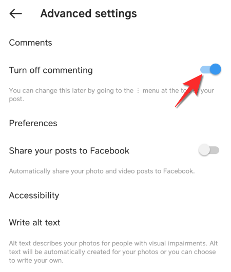 Right towards the end, you will also notice an Advanced settings option, here you can choose to enable/disable other users commenting on your post.