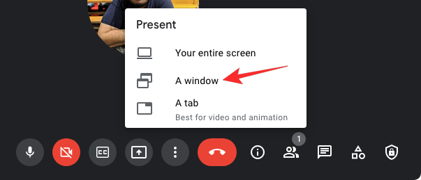 Click on the Share icon from meeting controls at the bottom and select how you wish to present a video from three options – Your entire screen, A window, or A tab.