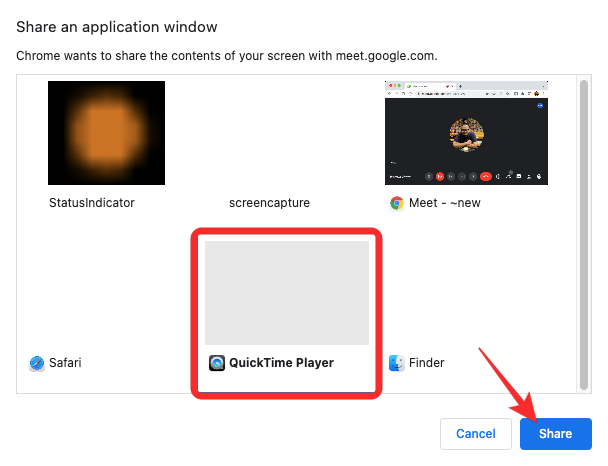 On the next screen, select the window where a video is playing, the one that you want to present inside the meeting. Once selected, click on Share.