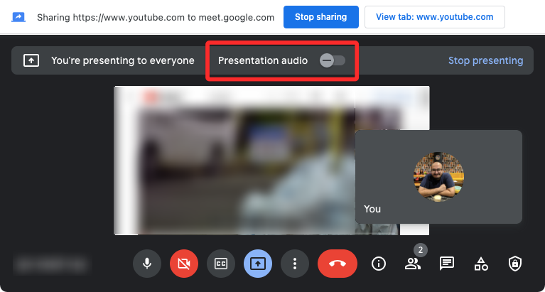 Usually, when you start or join a meeting on Google Meet, the audio is presented along with the video you’re sharing. In case the participants are unable to hear the audio, turn on the Presentation audio toggle at the top of the screen.