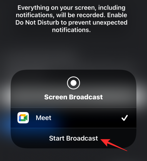 On iOS, select the app whose screen you want to share from the overflow menu and tap on Start Broadcast.