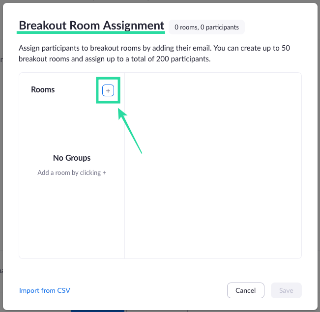 Step 5: Once you’re inside the Breakout Room Assignment screen, you can create subgroups by clicking on the ‘+’ icon next to Rooms.