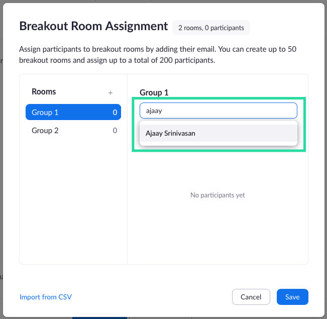 Step 6: Now you can proceed to add participants to breakout rooms by selecting a group and typing the names or email addresses of users you want to pre-assign to the group.
