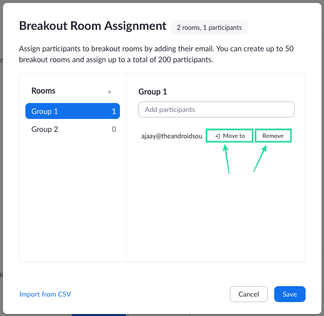 Remove or move a participant to another group: Hovering over a participant’s listing gets you two options – Remove and Move to. Choosing the former will delete the person from the breakout room while the latter will let you move them to another breakout room in your meeting.