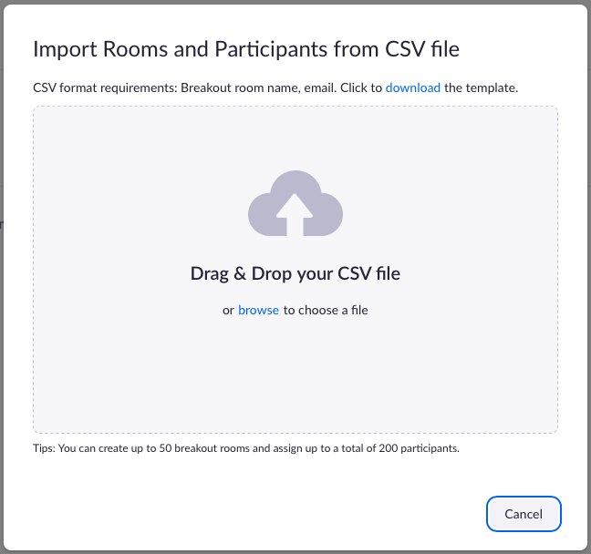 Step 5: You can click anywhere inside the ‘Drag & Drop your CSV file’ box to upload a CSV file that has your participants’ name and email address in two columns – Pre-assign Room name and Email address. You can create a CSV file or edit this sample file with all your addresses and name using Microsoft Excel on Windows or Numbers on Mac.
