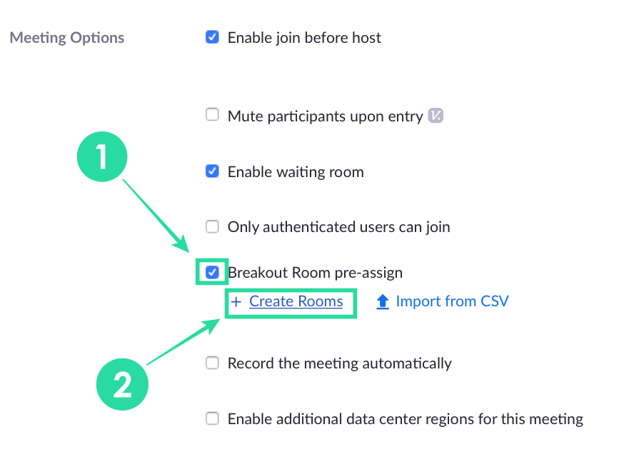 Step 4: Inside Meeting Options, checkbox the ‘Breakout Room pre-assign’ option and click on the ‘+ Create Rooms’.
