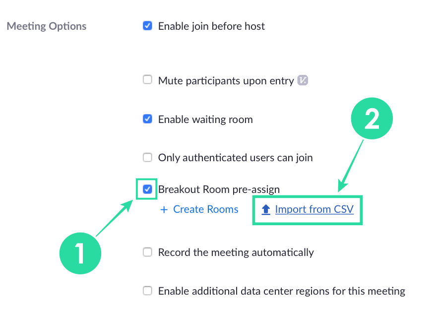 Step 4: Inside Meeting Options, checkbox the ‘Breakout Room pre-assign’ option and click on the ‘Import from CSV’ option.