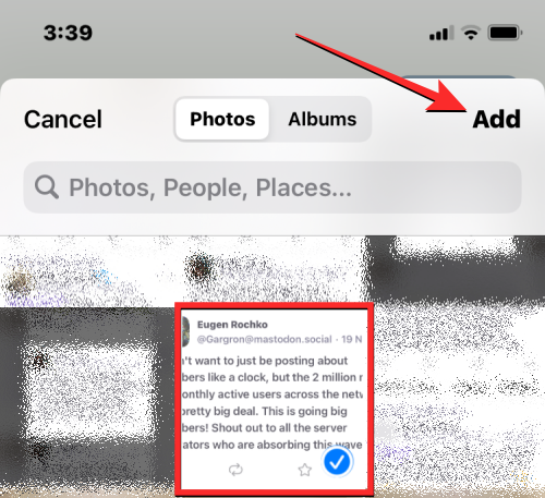 You’ll see all the pictures and videos from the Photos app on the next screen. Here, select the screenshot you want to share and tap on Add at the top right corner.