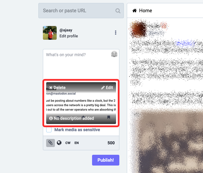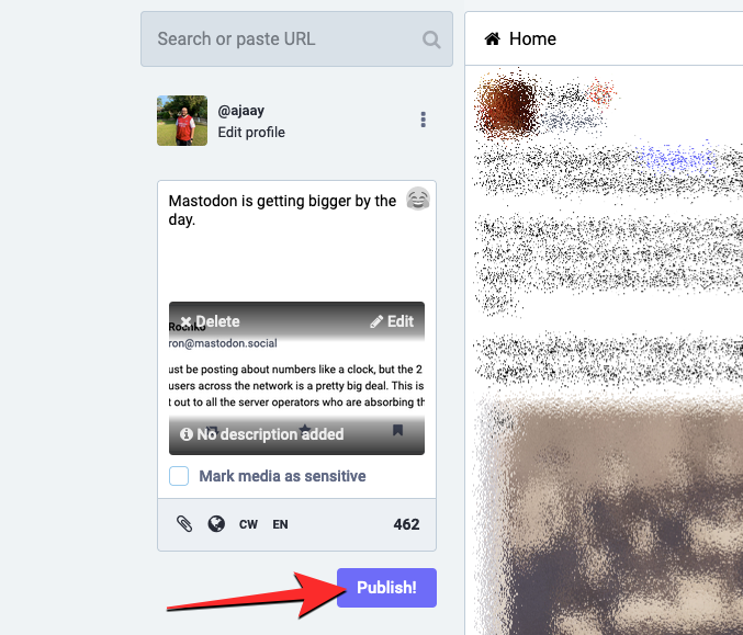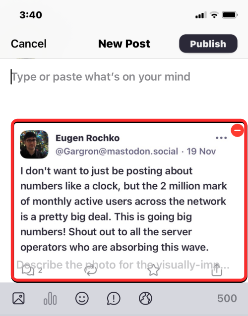 This will upload the screenshot to Mastodon. When the image’s preview shows up, you can now add your own message that you want to post on top of the quoted (screenshotted) post.