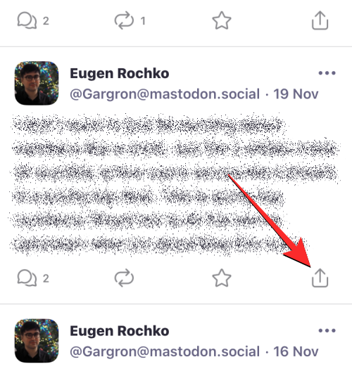To share a link to a post from your phone, open the Mastodon app on iOS/Android and locate the post you want to quote. When the post you want to share has been located, tap on the Share icon at the bottom right corner of the post.
