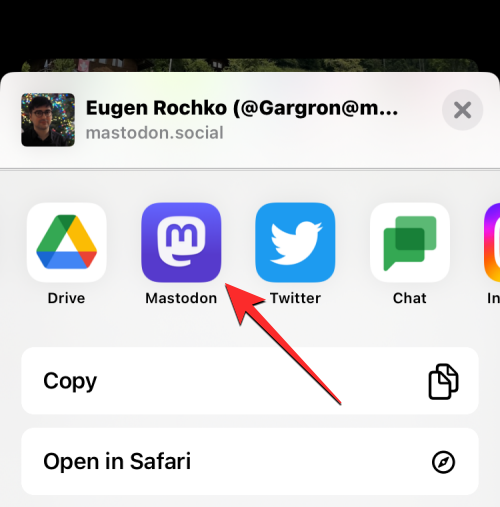 On the share sheet/menu that appears next, select Mastodon from the list of apps.