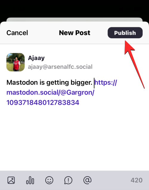Your post with a link to the quoted post will be uploaded and accessible to your chosen audience on Mastodon.