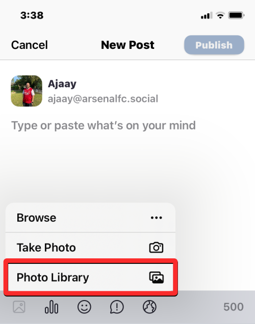 In the New post screen that loads up, tap on the pictures icon at the bottom left corner.