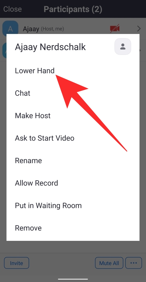 If you’re using Zoom on a phone, you can lower a participant’s raised hand by tapping on the ‘Participants’ tab in the meeting screen, tapping on the user’s name, and then selecting the ‘Lower Hand’ option from the popup menu.