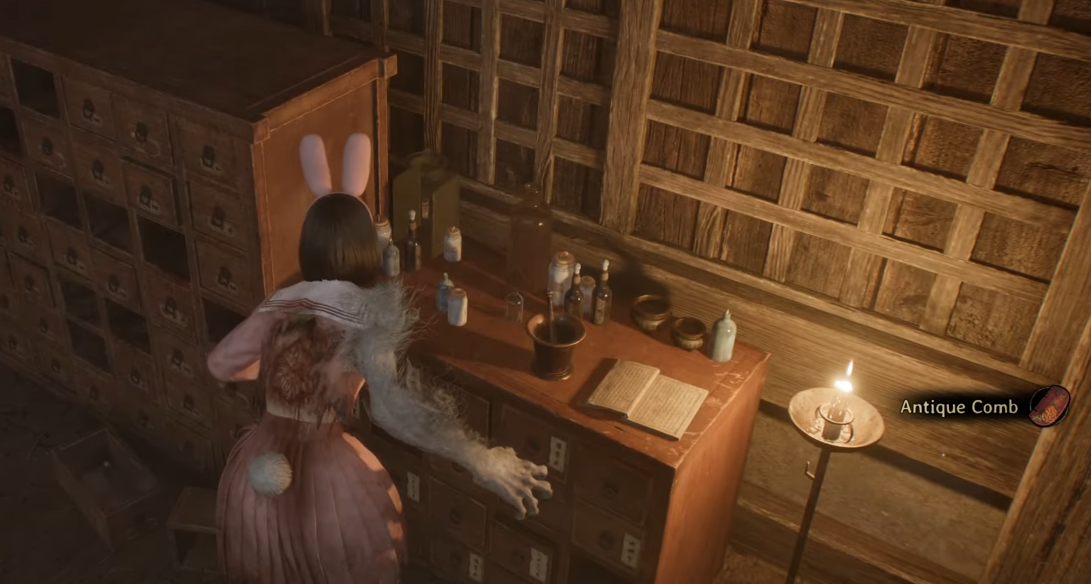 Explore the hall to collect items such as bandages and an antique comb.