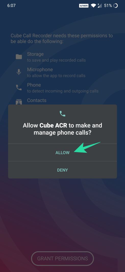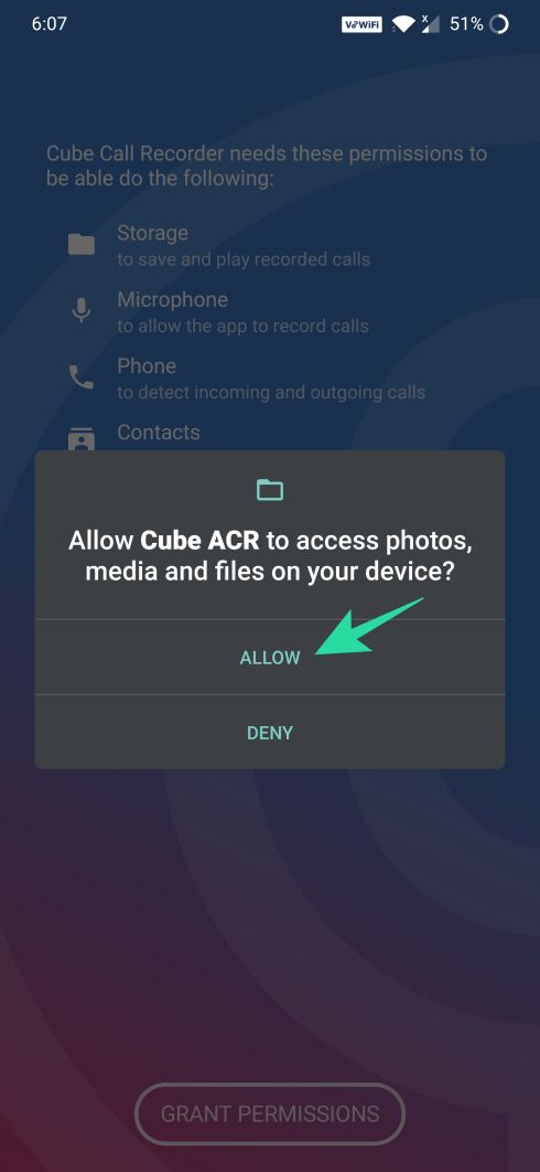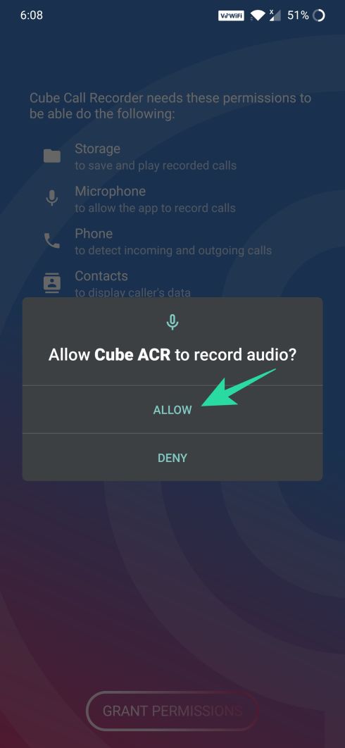 Step 5: You will now be prompted to allow the app access to contacts, phone, storage, and microphone. To do that, tap on Allow for the different permissions.