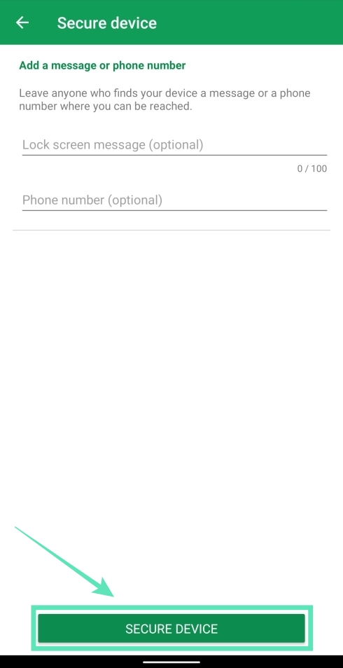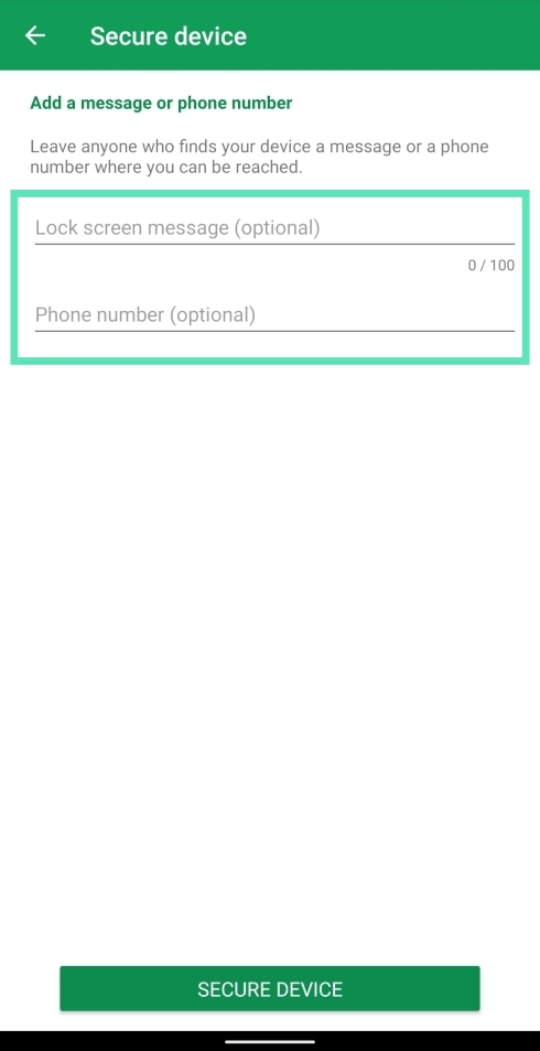 • Lock your device: You can select the Secure Device option to lock your smartphone set a new password to unlock it. Tap on Secure device, enter the phone number and personalized message you want to show up on the lost phone and tap on Secure device again to lock your lost smartphone.