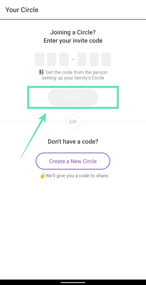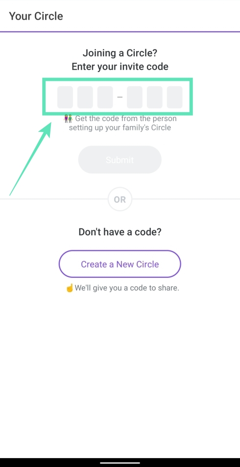 Alternatively, you can join an already created circle by entering a given code in the relevant boxes and tapping Submit.