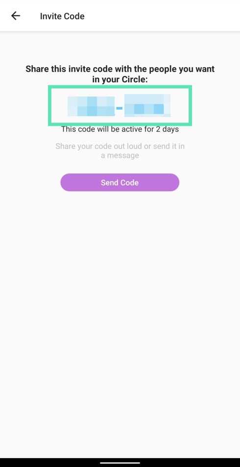 • Invite new members to a circle: Tap on the ‘+’ icon and press Invite. An invite code will then pop up on the next screen which you can share with users on chat and social media by tapping Send code.
