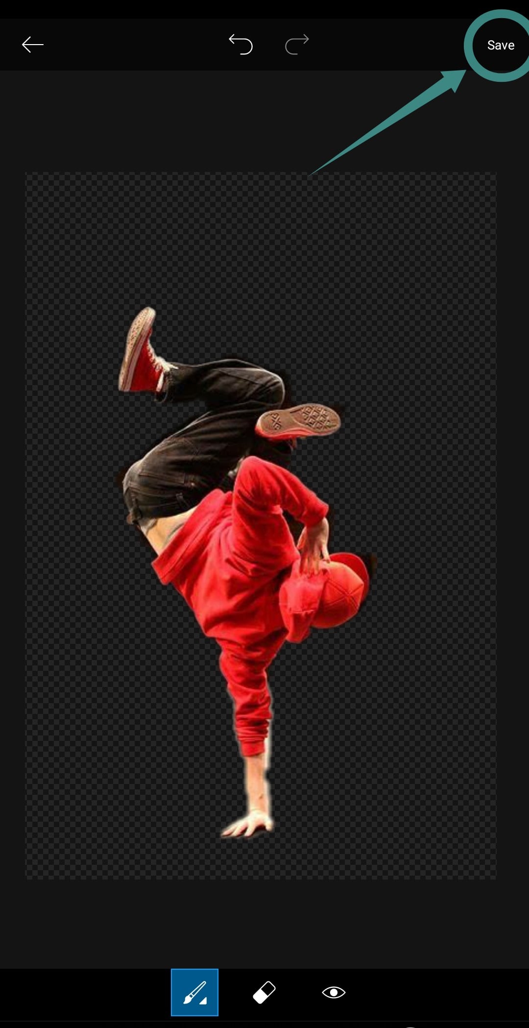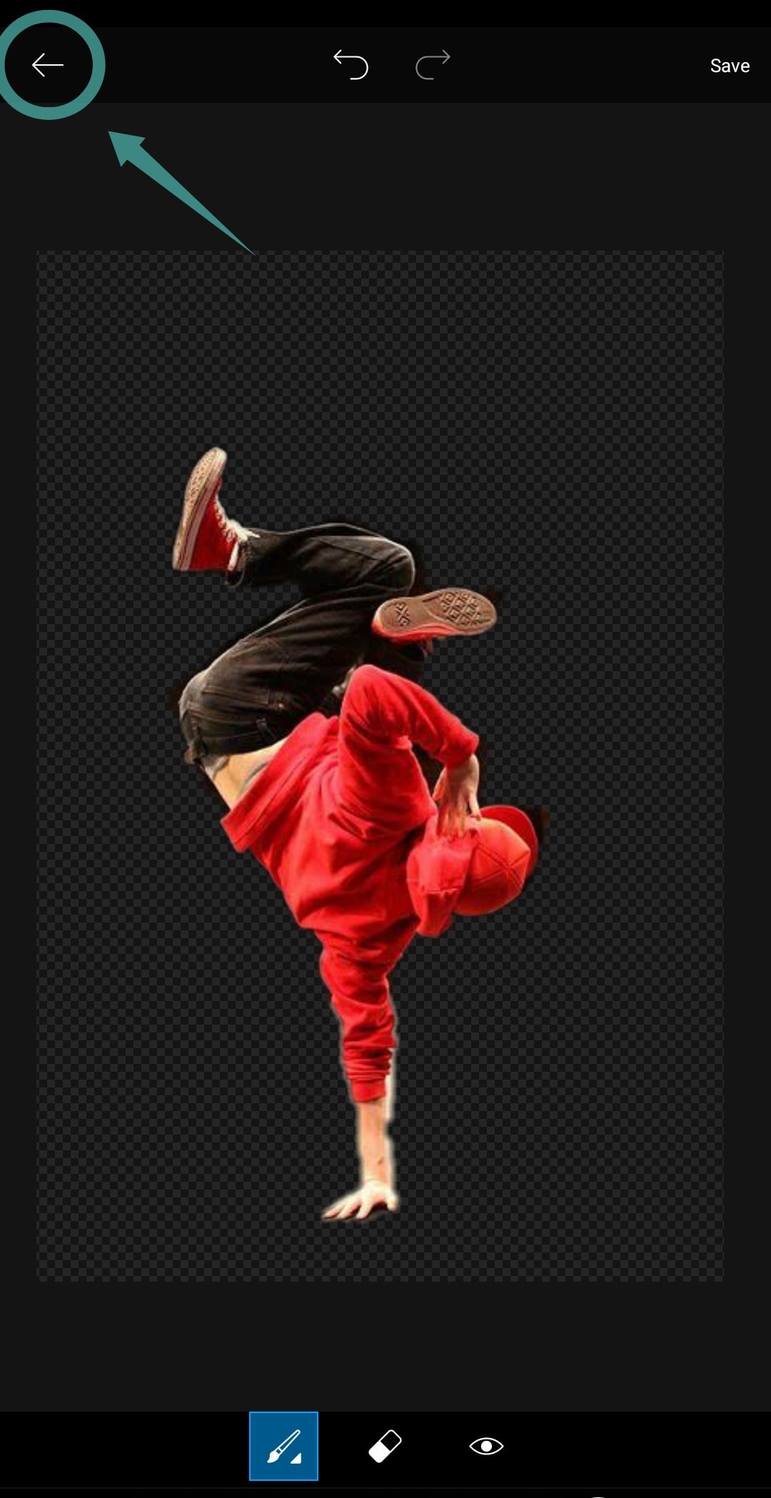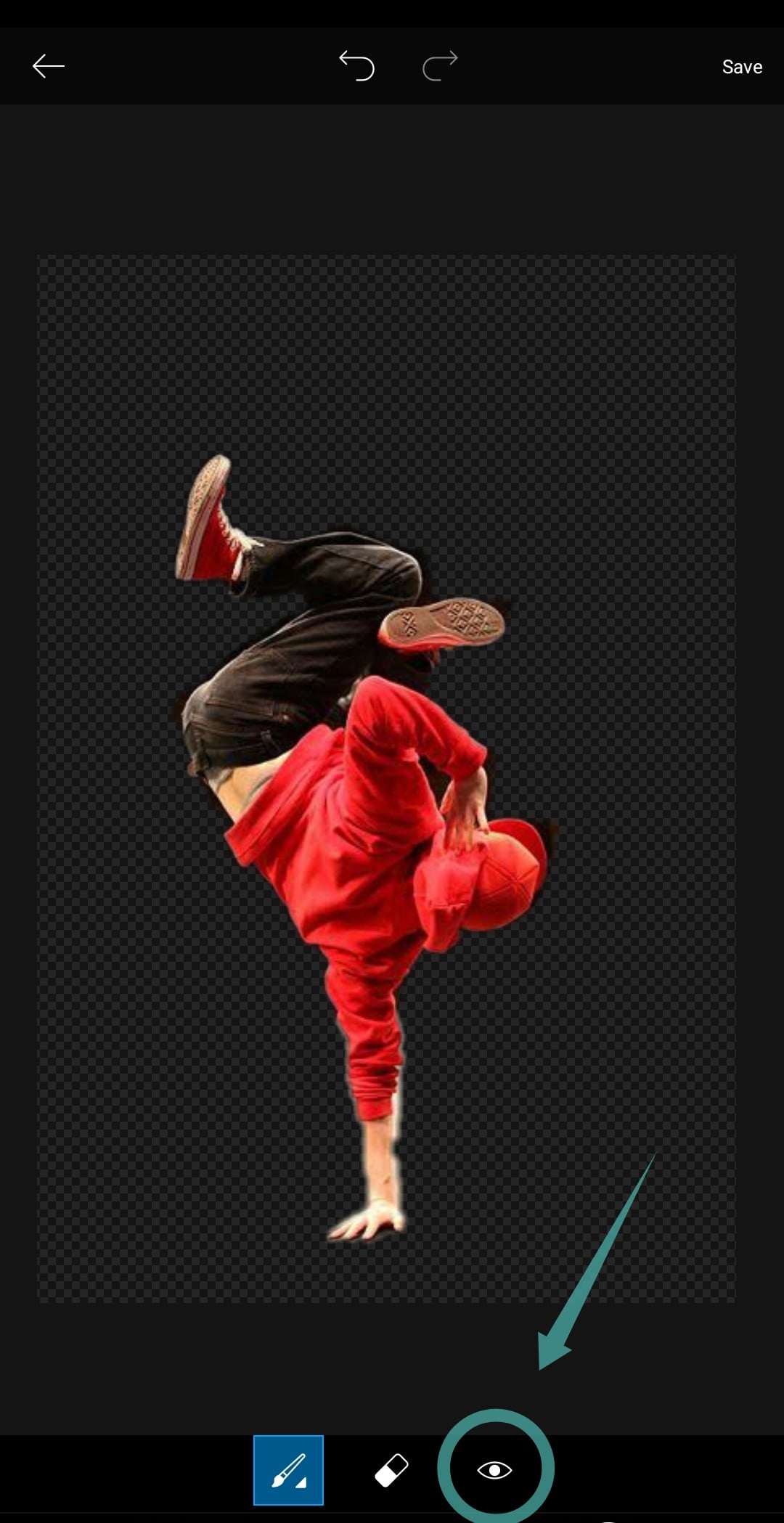 Step 7: Picsart will automatically use its algorithms to determine the subject in question and separate it from the background. Tap on the eye icon as shown below, in order to get a preview of the final image. You can edit this preview using the eraser and draw tool to get a more refined selection.
