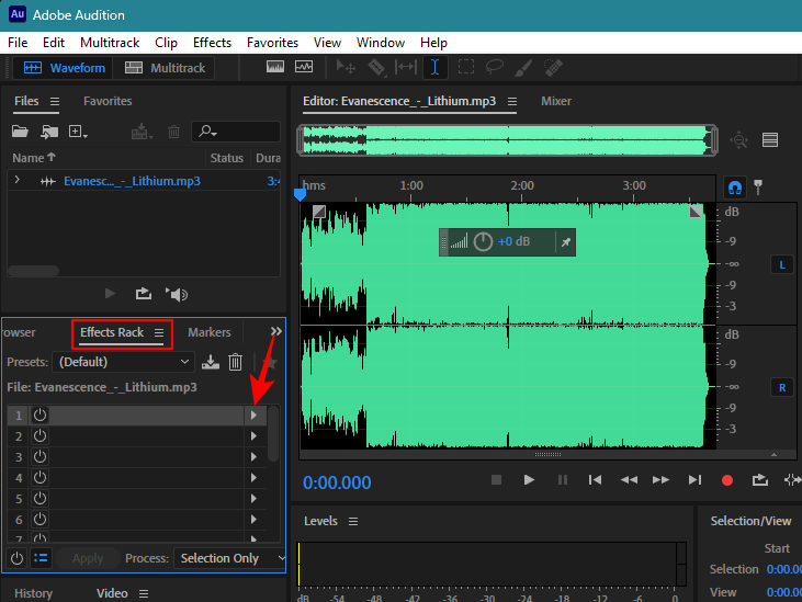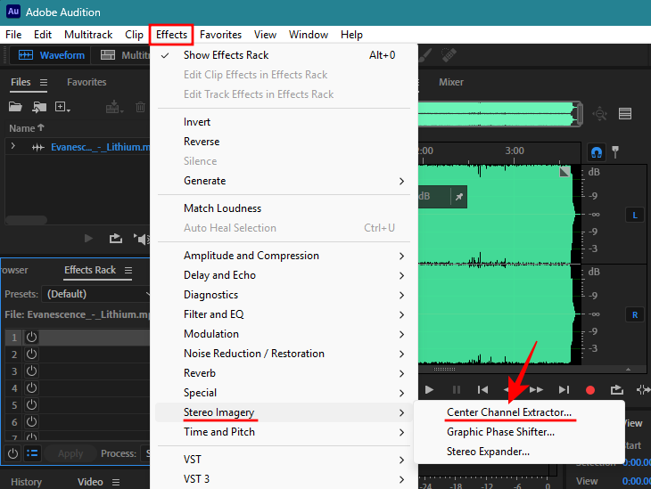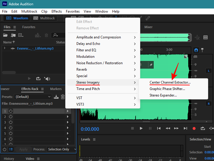 As before, import your song by dragging and dropping it into Adobe Audition. Then add the Center Channel Extractor effect in one of the slots under ‘Effects Rack’. Thereafter, use the steps given below.