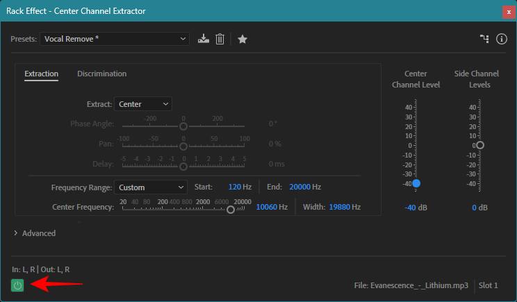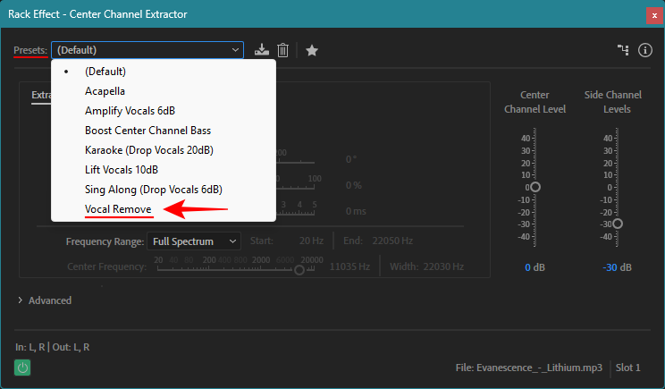 In the ‘Center Channel Extractor’ window, make sure the Preset is set to Default or Acapella.