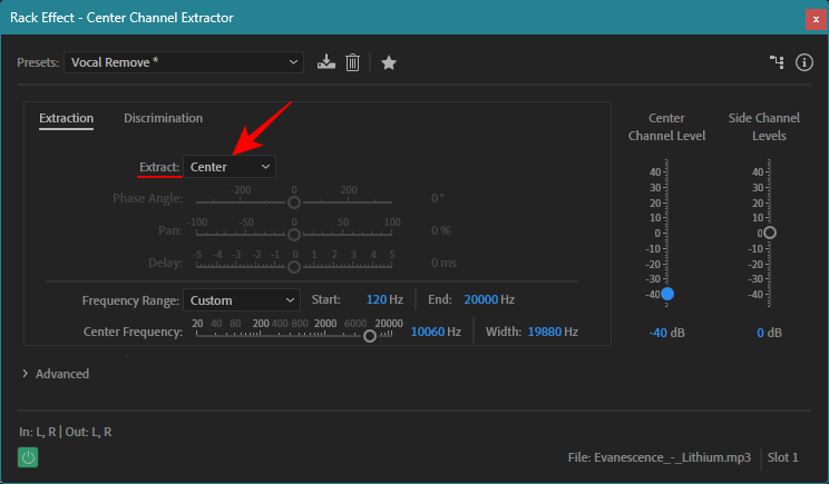 You can choose either of these presets or turn down the side channel levels yourself and apply custom settings. Whatever you do, make sure the ‘Extract’ option is set to Center.