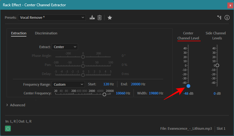 By default, the Vocal Remove preset will lower the volume of the center channel down to -40 decibels. If you want to lower or raise the center channel volume, use the ‘Center Channel Level’ slider on the right.