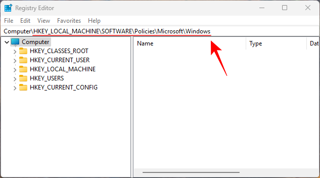 Step 2: Navigate to the following address: HKEY_LOCAL_MACHINE\SOFTWARE\Policies\Microsoft\Windows