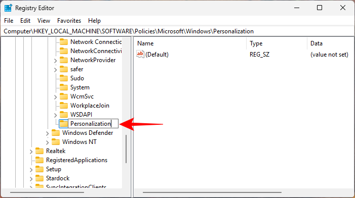 HKEY_LOCAL_MACHINE\SOFTWARE\Policies\Microsoft\Windows. - Under Windows, create a new key called Personalization.