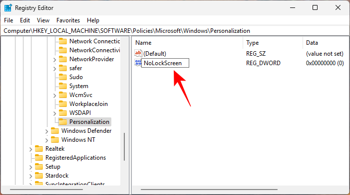 - Under Personalization, create a DWORD (32-bit) Value called NoLockScreen and change its data value to 1.