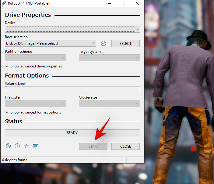 - Download and launch Rufus on your device. Once launched, click on ‘Device’ at the top and select your USB drive.