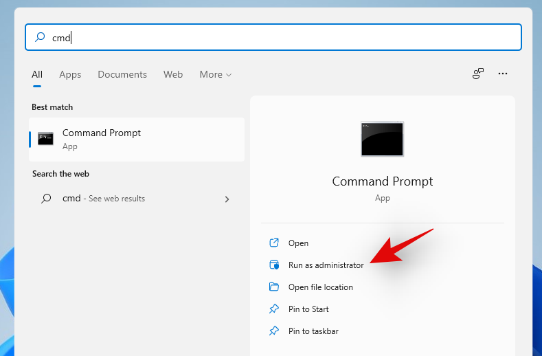 - Click the ‘Search’ icon in your taskbar and search for ‘CMD’. You can also press ‘Windows + S’ on your keyboard to bring up the search. Click on ‘Run as administrator on your right.