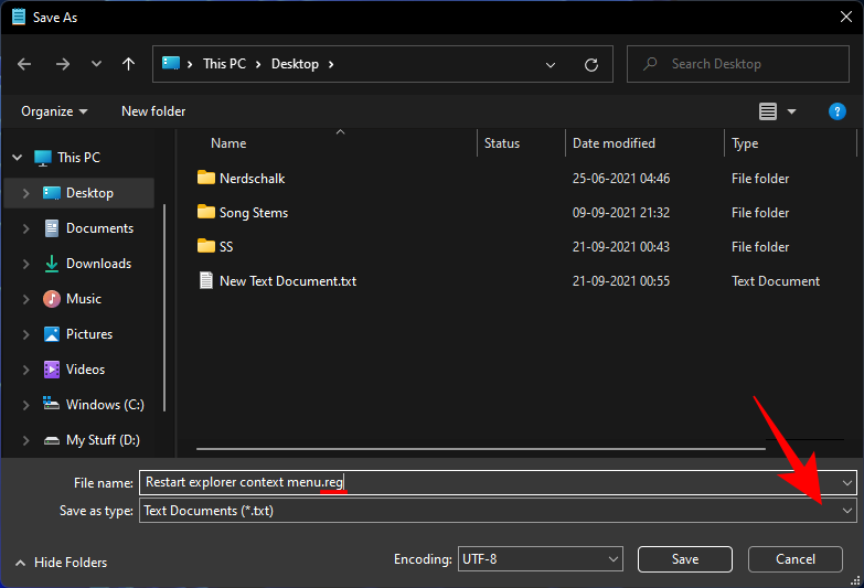 - Give this file a name and end it with .reg. Then click on the drop-down menu next to Save as type.