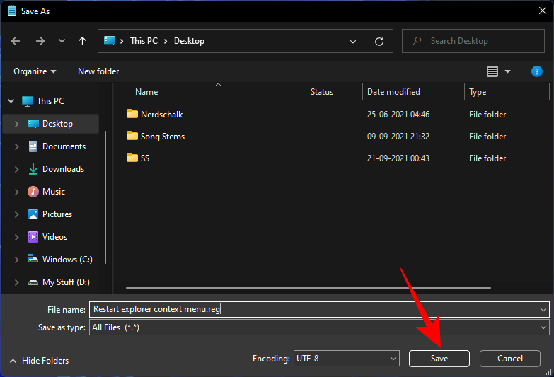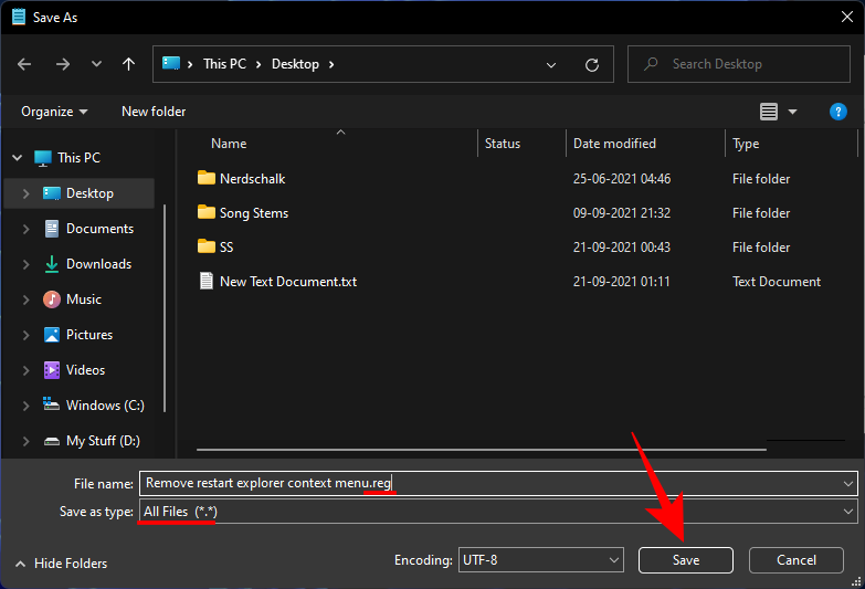 - Save the file as a .reg file as we did before and save file type as ‘All files’. Then click Save.