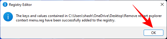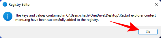 - You will now get a confirmation message that the keys and values in this file are successfully added to the registry. Click OK.
