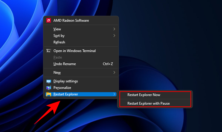 - The option to Restart Explorer will be at the bottom. Hover over it to get the options to Restart Explorer Now or Restart Explorer with Pause.