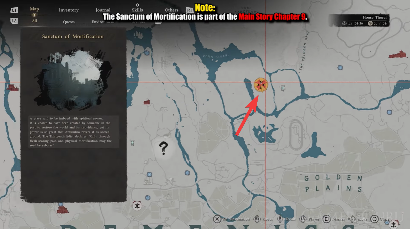 Sanctum of Mortification is near the Crimson Wall, north of Demeniss. As you begin inside the sanctum, you are essentially standing at the heart of a broken power system. The architecture around you may seem symmetrical, but subtle elevation changes and hidden openings guide your path.