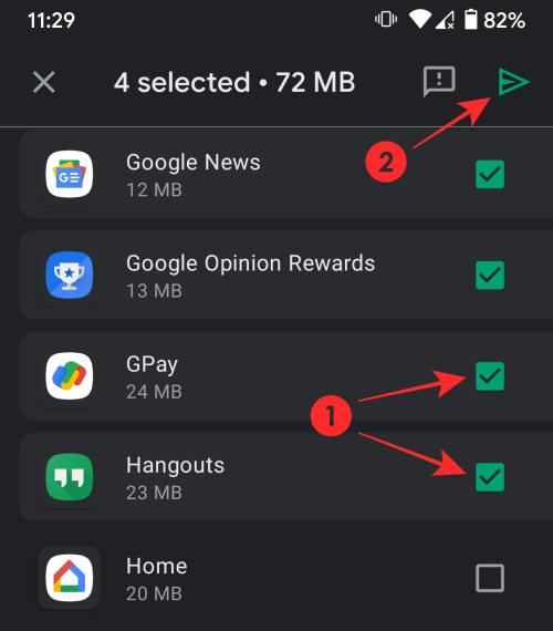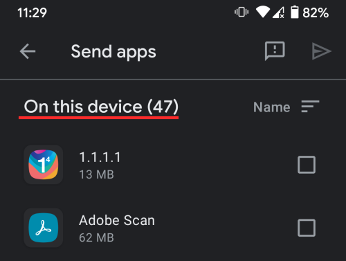 On this screen, tap on the boxes adjacent to the apps you wish to share with another Android. After you have selected the apps you want to share, tap on the ‘Share’ icon at the top right corner.