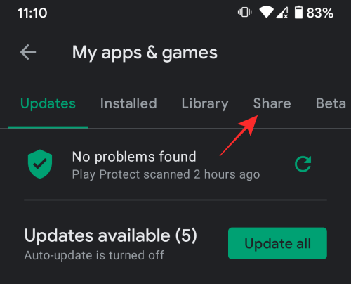 • Share tab is available inside Google Play Store: For this, you need to update Google Play Services on both Android devices. To check if you have the feature available on your device, open the Play Store, go to the Hamburger menu > My Apps & Games, and check if you have the ‘Share’ tab available.