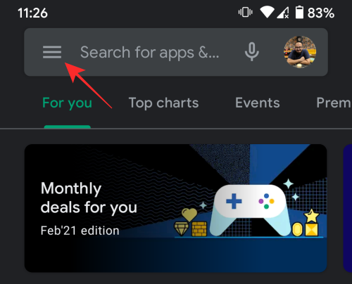 The process of sending Android apps from one device to another takes place using the Nearby Share feature and the Google Play Store which needs to be available on both devices. To get started, open the Google Play Store on the device you want to send the file from and tap on the hamburger button from the top left corner of your screen.