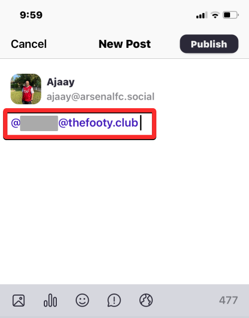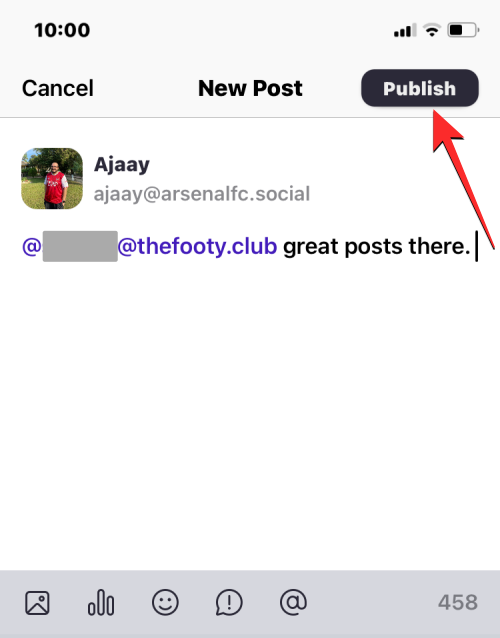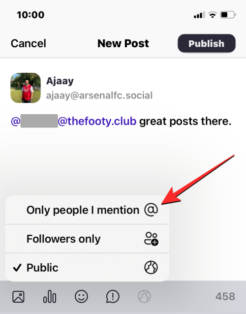 The post will now switch to a private message and will be indicated by an @ icon at the bottom. You can now send this message to the mentioned user by clicking on Publish underneath the text box.